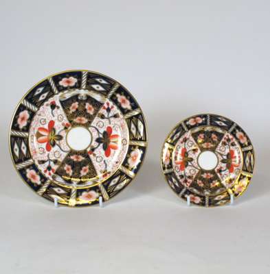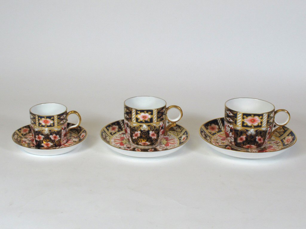 each item in the imari palette with printed marks, pattern number '2451', comprising: six tea cups and saucers; six coffee cups and saucers; six coffee cans and saucers; seven plates; three side plates; two dishes; a milk jug; a sugar bowl; a teapot and cover; and a coffee pot and cover; and a Derby style tea cup and saucer (53)