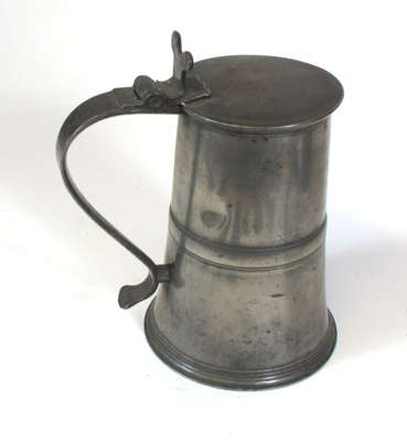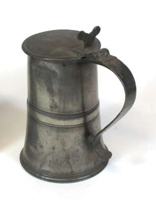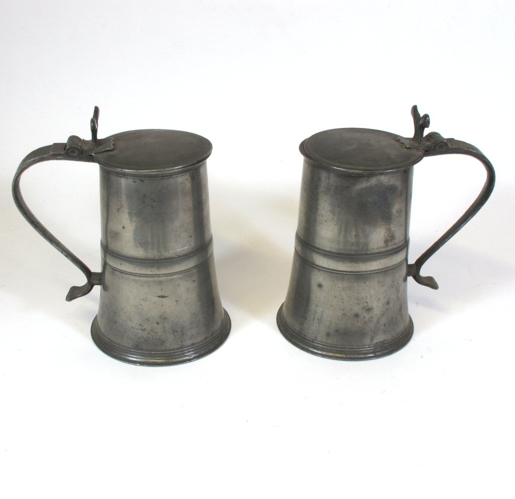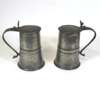 with circular tapered body, acorn finial, scrolled handle, indistinct marks (2)