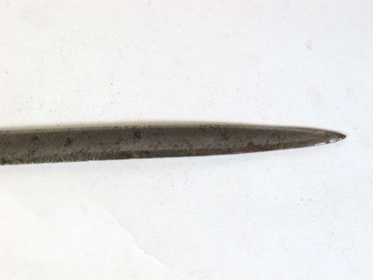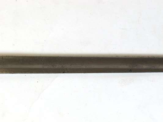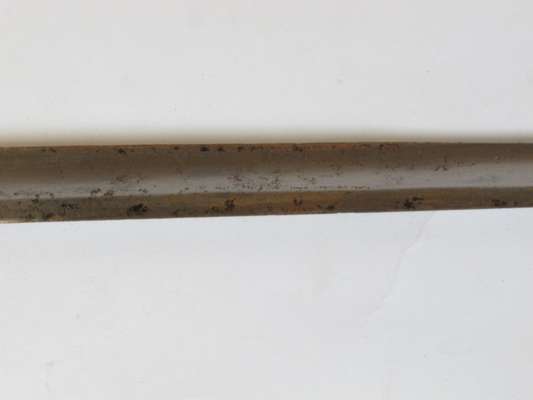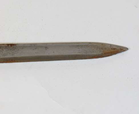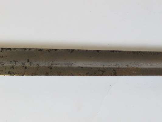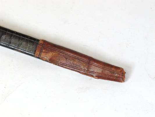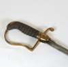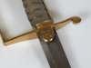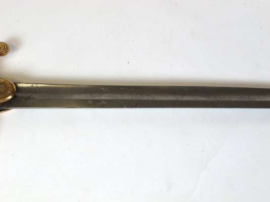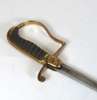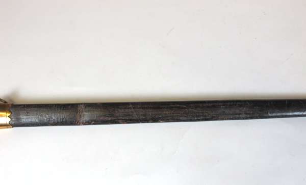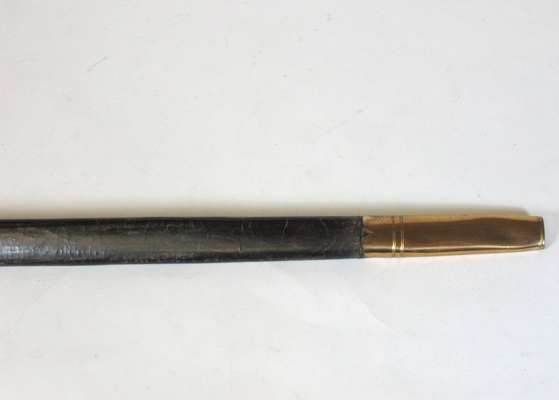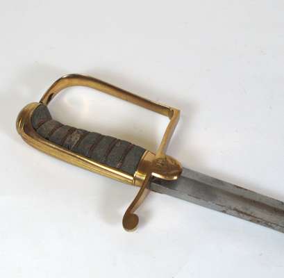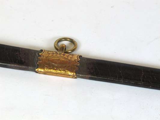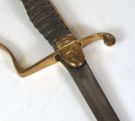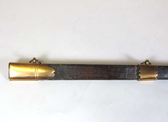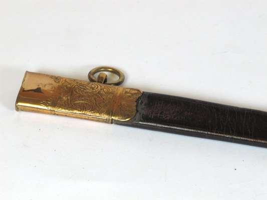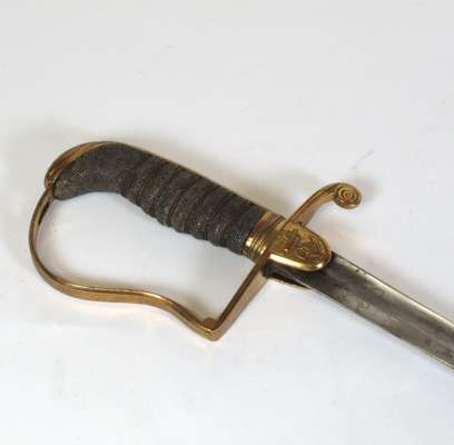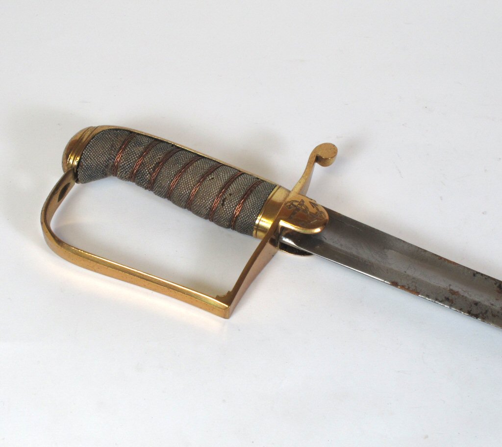 gilt brass stirrup hilt engraved with fouled anchors, fish skin grip bound with a triple twist of brass wire, etched blade, leather and brass mounted scabbard, blade 71cm long; and a smaller similar midshipman's naval sword, 65cm long (2)