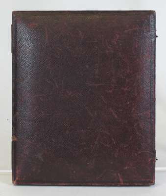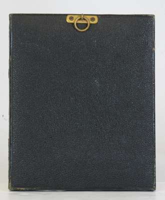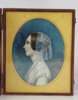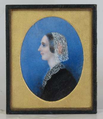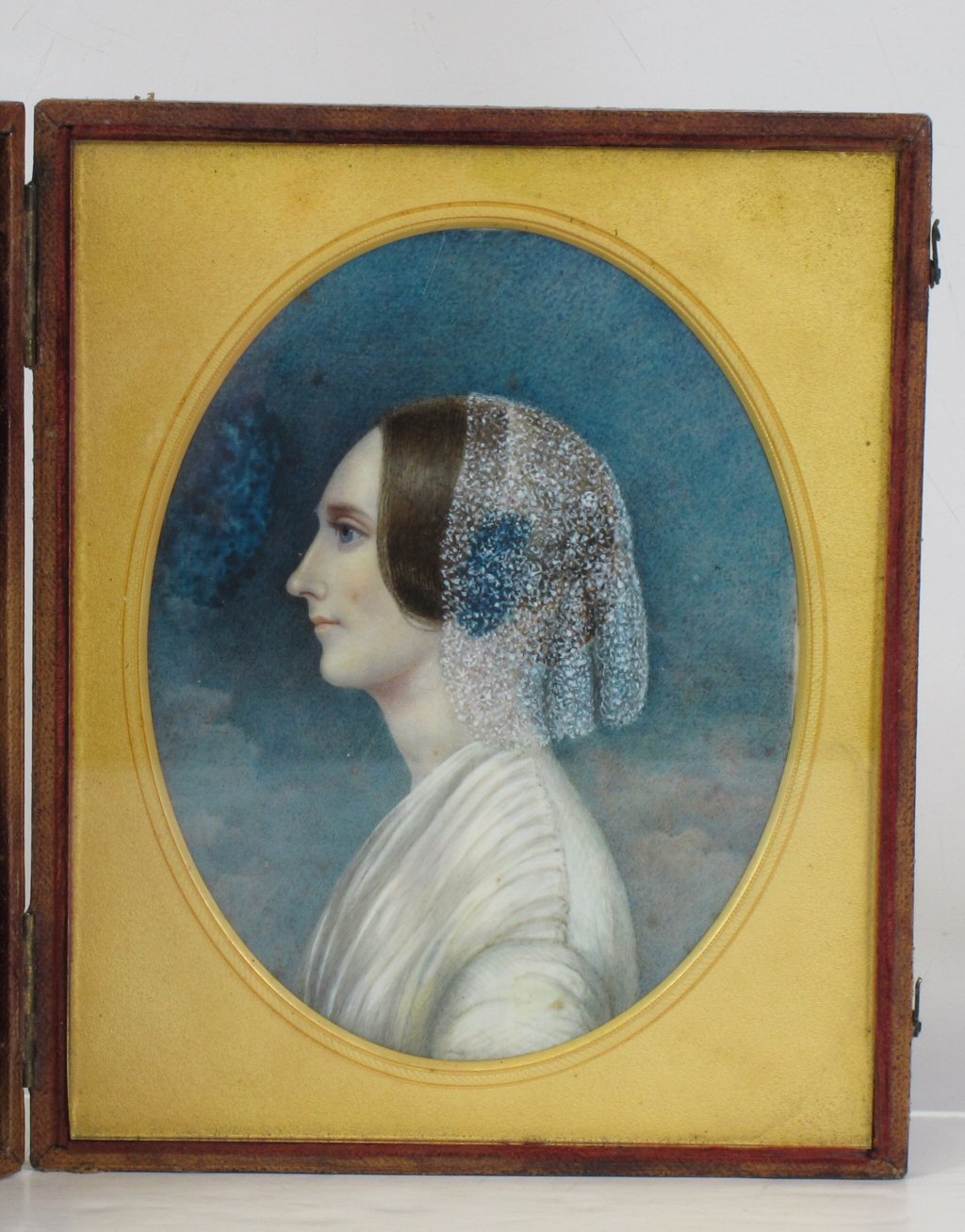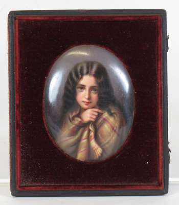 comprising: a watercolour of oval form depicting a lady, contained in a leather case, 12.5cm x 10cm; a watercolour of oval form depicting a lady, contained in a leather frame, 10cm x 7.5cm; and a painted plaque of oval form depicting a young girl, in a leather case, 7.5cm x 6cm (3)