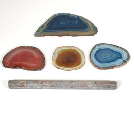 large quartz geode, 33cm high; an amethyst quartz sample, 7cm high; four agate coasters; and a marble sample (7)