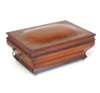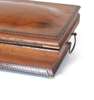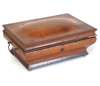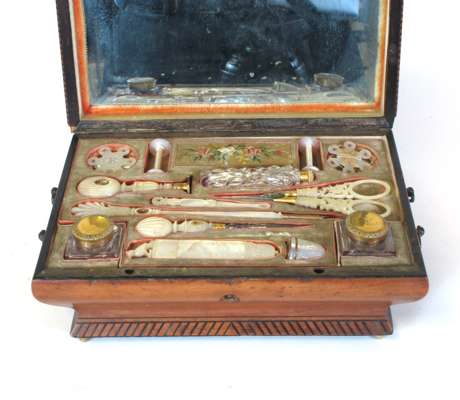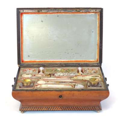 of tapering rectangular form with herringbone borders, the fitted interior with mirror and mother of pearl mounted accessories