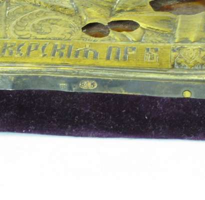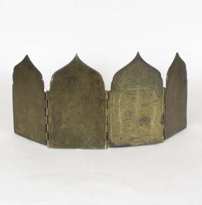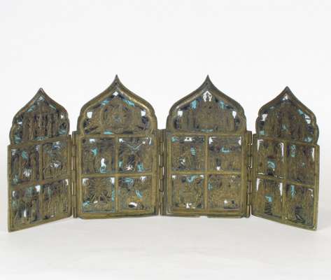 depicting the Madonna and Child, Russian control marks, 18cm wide, 22.5cm high; and a Russian brass and enamel travelling icon, with four folds of compartmented scenes, 39cm wide extended, 17cm high (2)