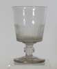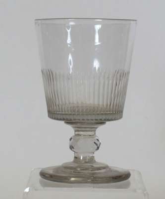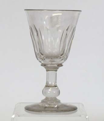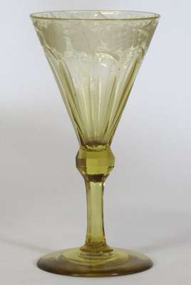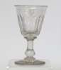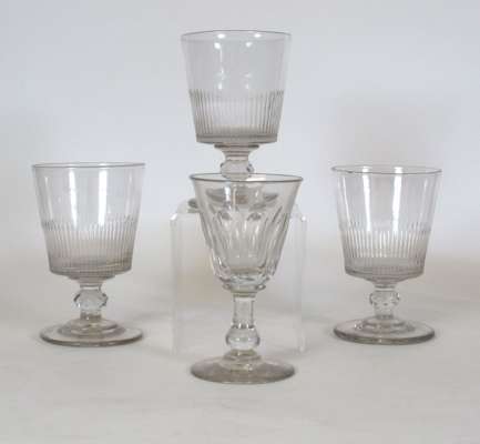 each with a fluted funnel bowl with etched leaf and berry design, facetted stem and conical foot, 14cm high; three glass rummers, each with a fluted bucket bowl, facetted knopped stem and conical foot, 13cm high; and a wine glass with fluted funnel bowl, knopped stem and conical foot, 13.5cm high (13)