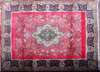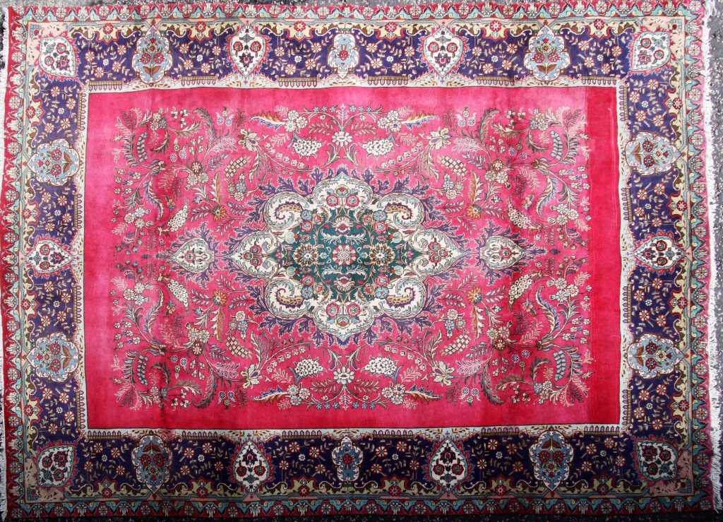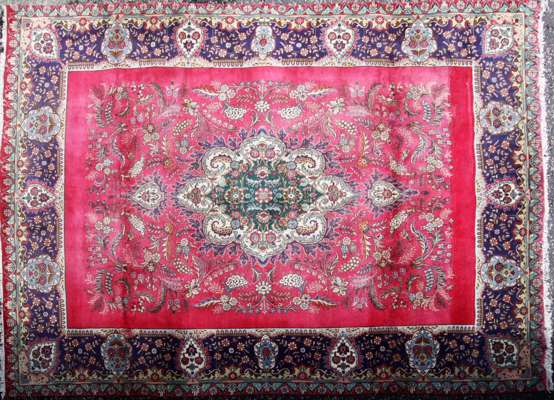 the deep rose field with central cream and green medallion, within indigo floral cartouche and vine border between bands