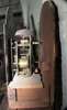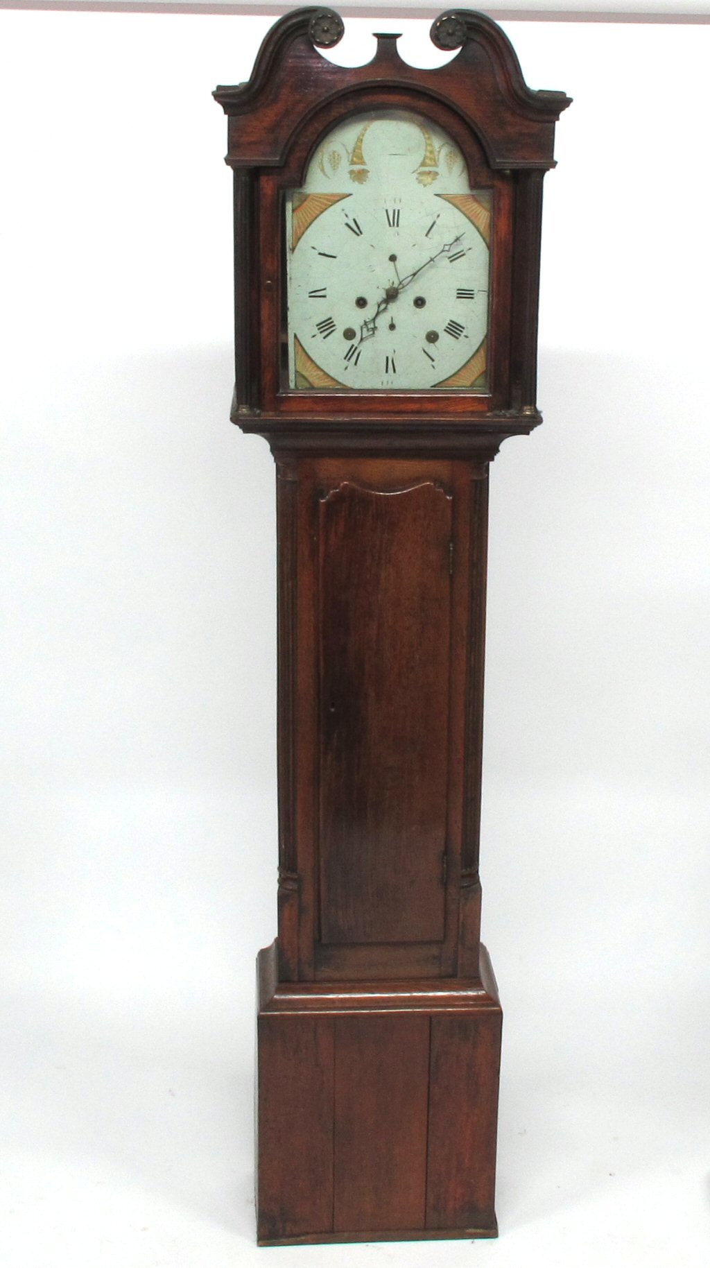 with swan neck pediment above white enamelled dial with batswing spandrels, shaped trunk door between fluted column angles, plinth base