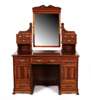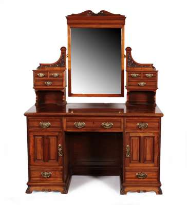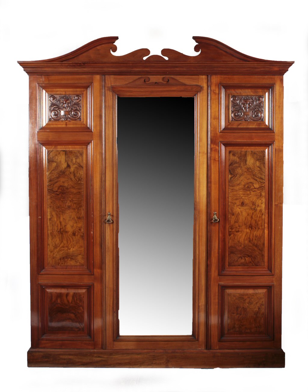 comprising; a three door wardrobe, the broken pediment over a central mirrored door, flanked by panelled doors, raised on a plinth base, 188cm wide, 229cm high, 60cm deep; and a dressing table the mirror plate over the moulded rectangular top above a long drawer, flanked by short drawers and panelled doors raised on a plinth base, 122cm wide, 170cm high, 56cm deep (2)
