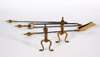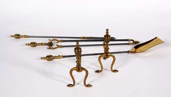 of urn shaped form raised on brass supports, over the plinth base raised on squat bun feet, 39cm wide, 65cm high; a pair of brass fire fogs, each with urn mounts; and a set of brass and steel fire irons including a poker, shovel and tongs (6)