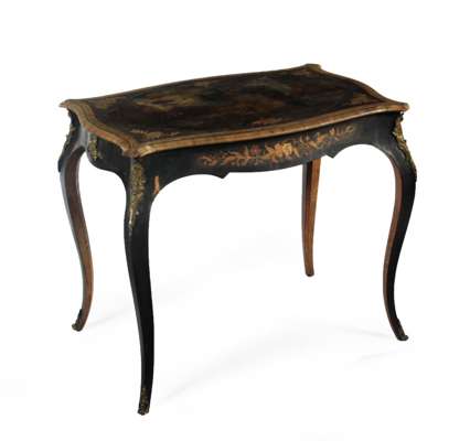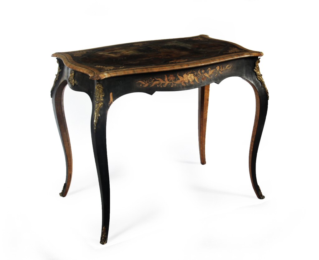 EBONISED AND FLORAL MARQUETRY DECORATED CENTRE TABLE