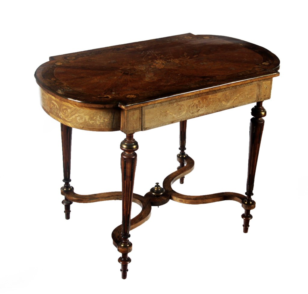 the shaped, inlaid top over an inlaid frieze drawer raised on turned fluted legs, united by stretchers
