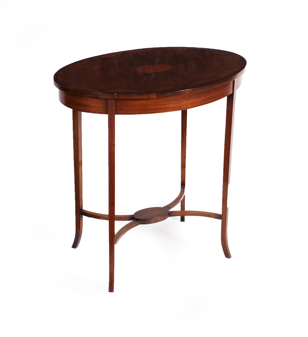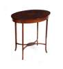 the inlaid top over a boxwood strung frieze, raised on boxwood strung square tapering legs, united by stretchers