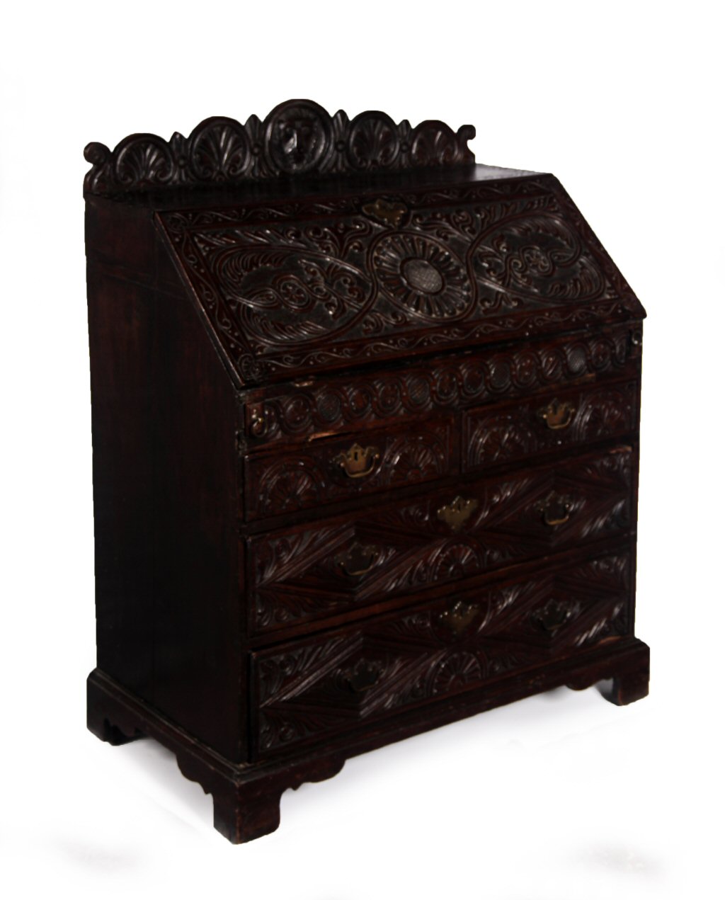 the carved gallery over a fall front enclosing a fitted interior, above two short and two graduated long drawers raised on bracket feet