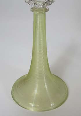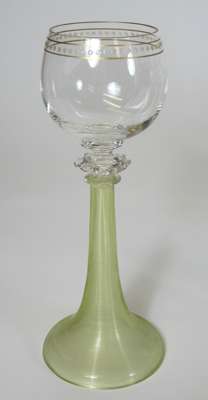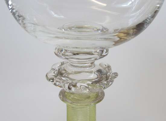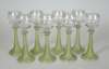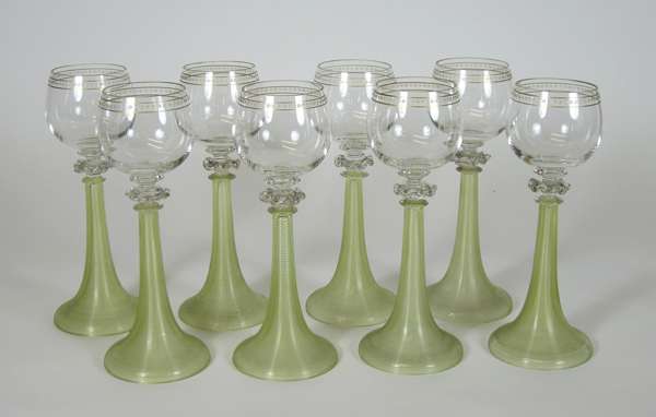 the first with a trumpet bowl above a knop, resting on a flat foot, 16.5cm high; the second with a trumpet bowl, resting on a conical foot, 18cm high; and a set of eight hock glasses, each with etched decoration to the bowl and trumpet shaped green glass stems, 20cm high (10)