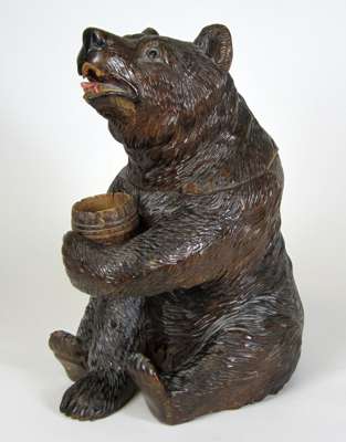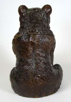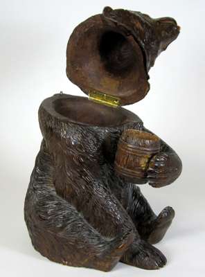 realistically modelled as a seated bear clasping a barrel, the hinged lid enclosing carved bowl, the base with musical action