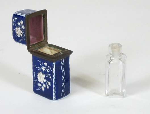 comprising: a patch box of hexagonal form, with flower sprig motifs and decorative blue panels, with inscription 'Alas love's dart, Gone in my heart', maker's mark, 4.5cm wide; a blue and white patch box with foliate decoration and an enclosed scent bottle, 5.5cm high; a blue and white patch box of rectangular form, maker's marks, 6cm wide; a patch box of oval form with a scene of birds and flowers and an inscription, 4cm wide; a patch box of oval form with an inscription, 4cm wide; a patch box of oval form with a scene of children playing, 4.5cm wide; a patch box in the form of a ladybird, 5cm wide; a brass snuff box with flush hinged cover, inscribed with owners name (8)