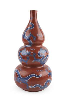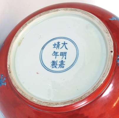decorated with dragons in underglaze blue with an overglaze red ground, six character blue Jaijing mark, but later
