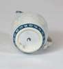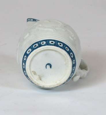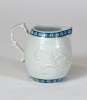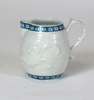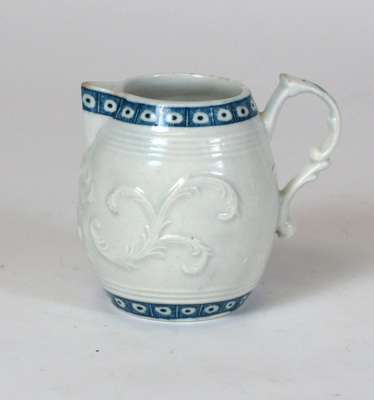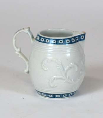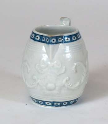 of silver shape, decorated in polychrome with flowers, red mark 'N172', 14cm high; and a Worcester cream jug of barrel form with relief moulded foliate scrolls between blue bands, crescent mark, 7.5cm high (2)
