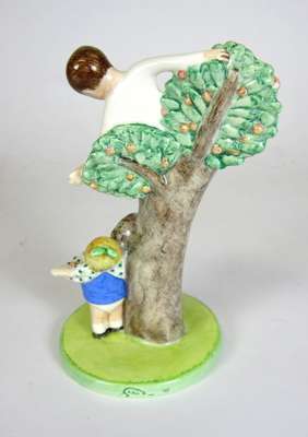 modelled as two children playing up a tree, on a circular base, painted and impressed maker's marks