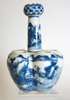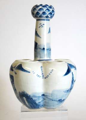 of lobed five sided bottle shaped form with an artichoke finial, decorated with a landscape scene, with character mark but later