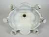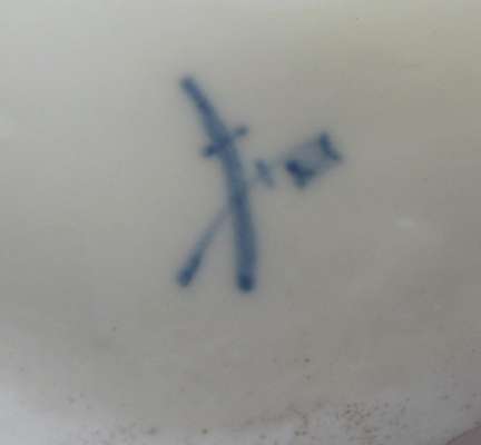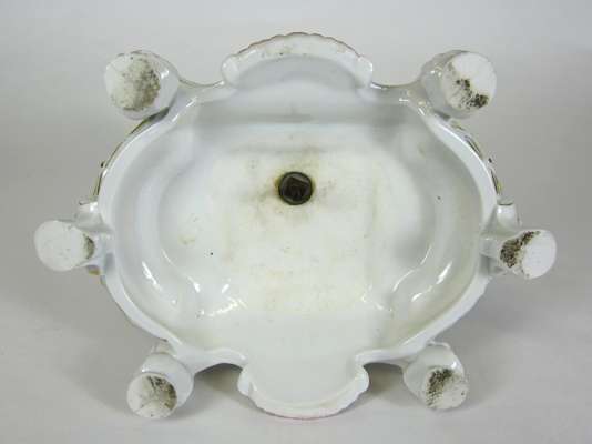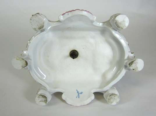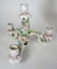 each with a central nozzle surrounded by three outscrolled branches over a column with a hunting trophy and a lady and boy, on a rococo scroll base, one with a blue maker's mark (2)