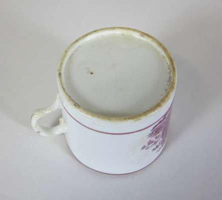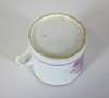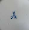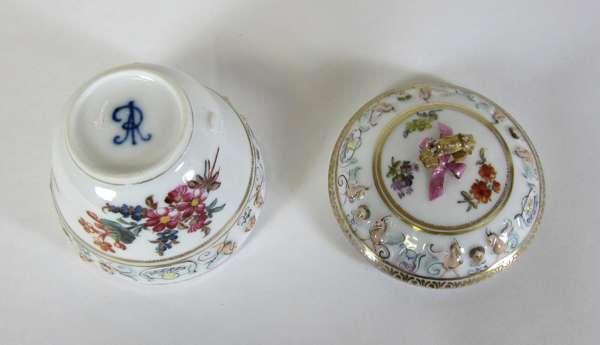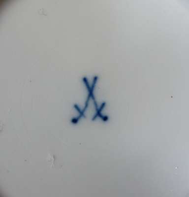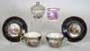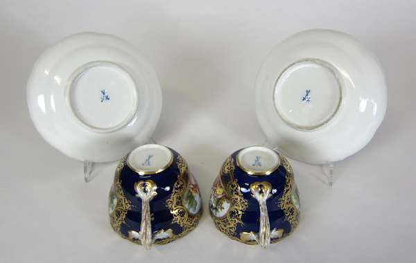comprising: a pair of Meissen cups and saucers, each with panels depicting figures in a landscape on a dark blue ground with gilt highlights, all with crossed swords marks, cups 6cm high each, saucers 13cm diameter each; and a Meissen style cup (handle missing) and matching lid, with relief polychrome and gilded decoration, blue mark, 10.5cm high; and a coffee can with purple monochrome decoration depicting two figures in a landscape with gilt highlights, 6cm high (6)
