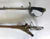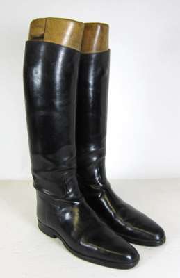 the first an officers pattern 1912 cavalry sword, the grip of fish skin bound with silver wire, the stepped pommel with raised laurel edging, narrow regulation blade with etched decoration, wide bowl hand guard with etched honeysuckle motive, in original polished steel scabbard, 110cm long; the second a light cavalry officer sword, undress pattern 1821, single edge blade, in leather field service scabbard, 108cm long; and a pair of leather military riding boots, 44cm high (3)
