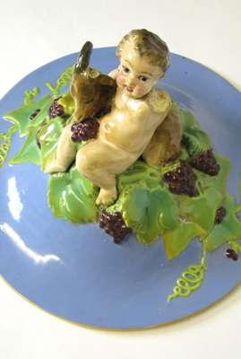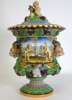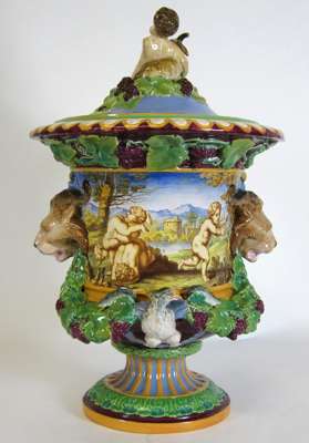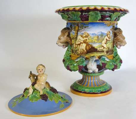 the domed lid surmounted by a cherub seated on a goat, the sides with twin mythical beast handles and painted with italianate scenes, the apron applied in high relief with fruiting vines supported by eagles, raised on a socle foot, printed puce mark