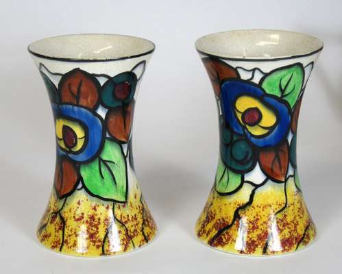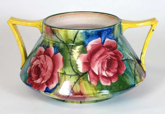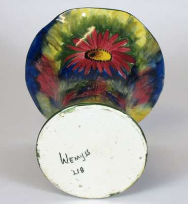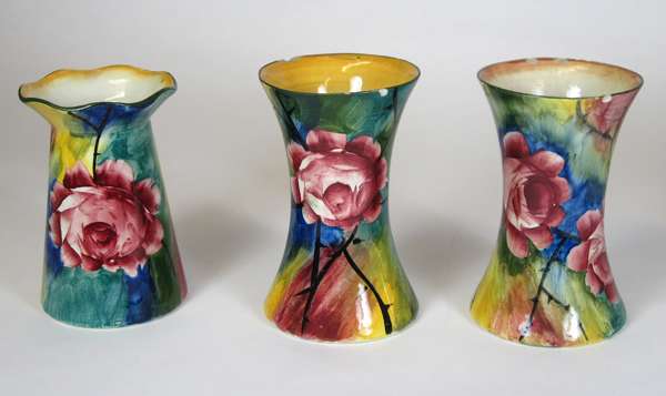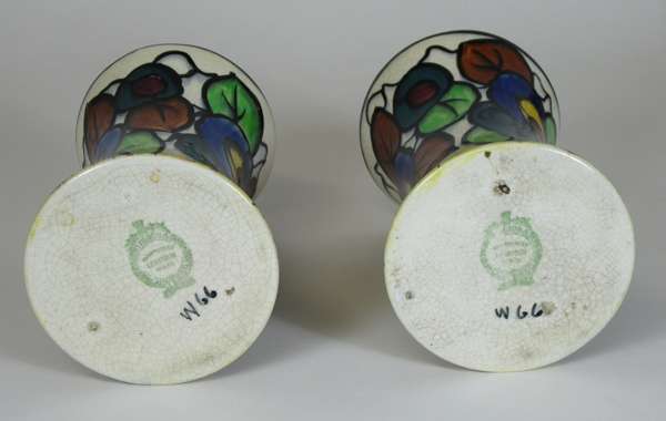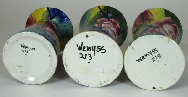 comprising: a twin-handled vase, painted marks 'Wemyss 213' and impressed mark 'Wemyss Ware R. H. & S', 13cm high; a pair of beaker vases, each with painted marks 'Wemyss 213', 15cm high; a grosvenor vase, painted mark 'Wemyss 213', 14.5cm high; a Lady Eva vase, painted mark 'Wemyss 218', 15cm high; a 'Methven' pot, with stamped mark, (lacking cover), 14cm diameter; and a pair of 'Langtoun' beaker vases, each with stamped mark and painted mark 'W66', 16cm high (8)