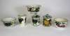 comprising: a cherries frilled bowl, impressed marks 'Wemyss', 17cm diameter; a cherries porridge bowl, impressed mark, 12.5cm diameter; a purple plums frilled bowl, impressed and painted marks 'Wemyss', 14cm diameter; a purple plums beaker, painted mark 'Wemyss' and impressed mark, 11.5cm high; a purple plums medium preserve jar and cover, 12.5cm high; and an oranges medium preserve jar and cover, painted mark 'Wemyss T. Goode London', 12.5 cm high (6)