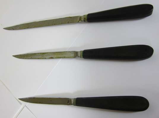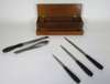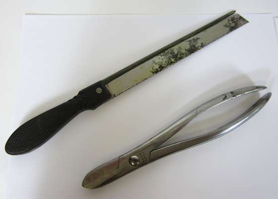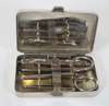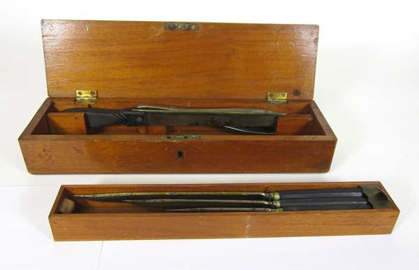containing a serrated blade knife, a pair of metal pliers and three curved blade knives; a metal boxed pocket field kit with initial inscription 'D. S. M.', containing various medical and surgical instruments; and a further metal boxed pocket field kit of oblong form, containing a syringe and various other medical instruments(3)