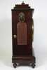 the movement chiming on a bell with a pendulum and the cream dial with Roman chapters, all housed in the rectangular case with fish scale side panels and twin lions mask and loop handles, surmounted by a reeded arch pediment and carved finial, all resting on four feet