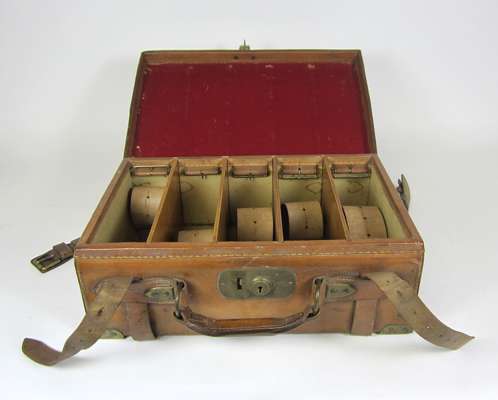 comprising: a good quality canvas game bag; a brass mounted leather magazine box with fitted interior with straps; a pair of ear defenders etc (qty)
