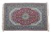 the burgundy field with central blue cusped medallion, blue and cream spandrels, within indigo palmette and scrolling vine border between grey bands