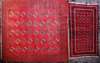 the red field with five columns of eight guls, within brown cross and lozenge border between bands, 266cm x 226cm; and a similar rug, the red field with five columns of fourteen guls, 196cm x 128cm (2)
