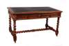 the moulded rectangular top with inset skiver above two carved frieze drawers, raised on spiral turned legs, united by stretchers