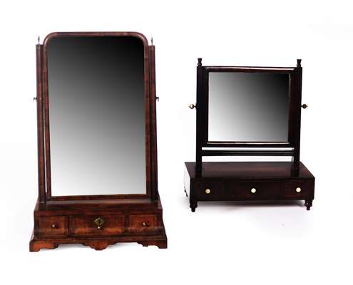 the rounded rectangular mirror plate within a moulded frame, flanked by supports, over one long and two short drawers, raised on bracket feet, 42cm wide, 65cm high, 24cm deep; also a Georgian mahogany dressing mirror, the rectangular mirror plate within cushioned frame, flanked by reeded supports, over three drawers, raised on turned feet, 45cm wide, 54cm high, 22cm deep