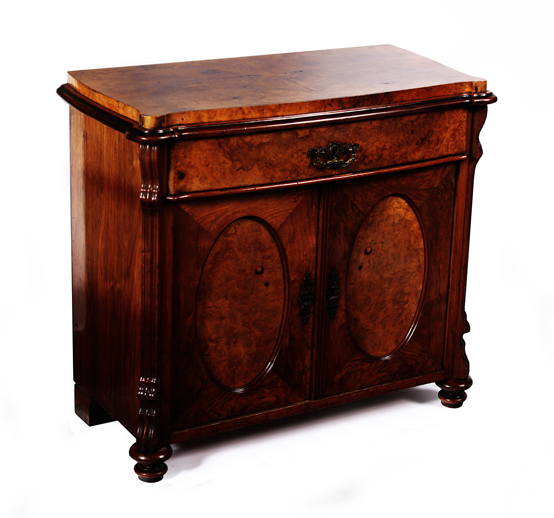 the shaped, moulded top above a single drawer, over paneled doors, raised on turned feet