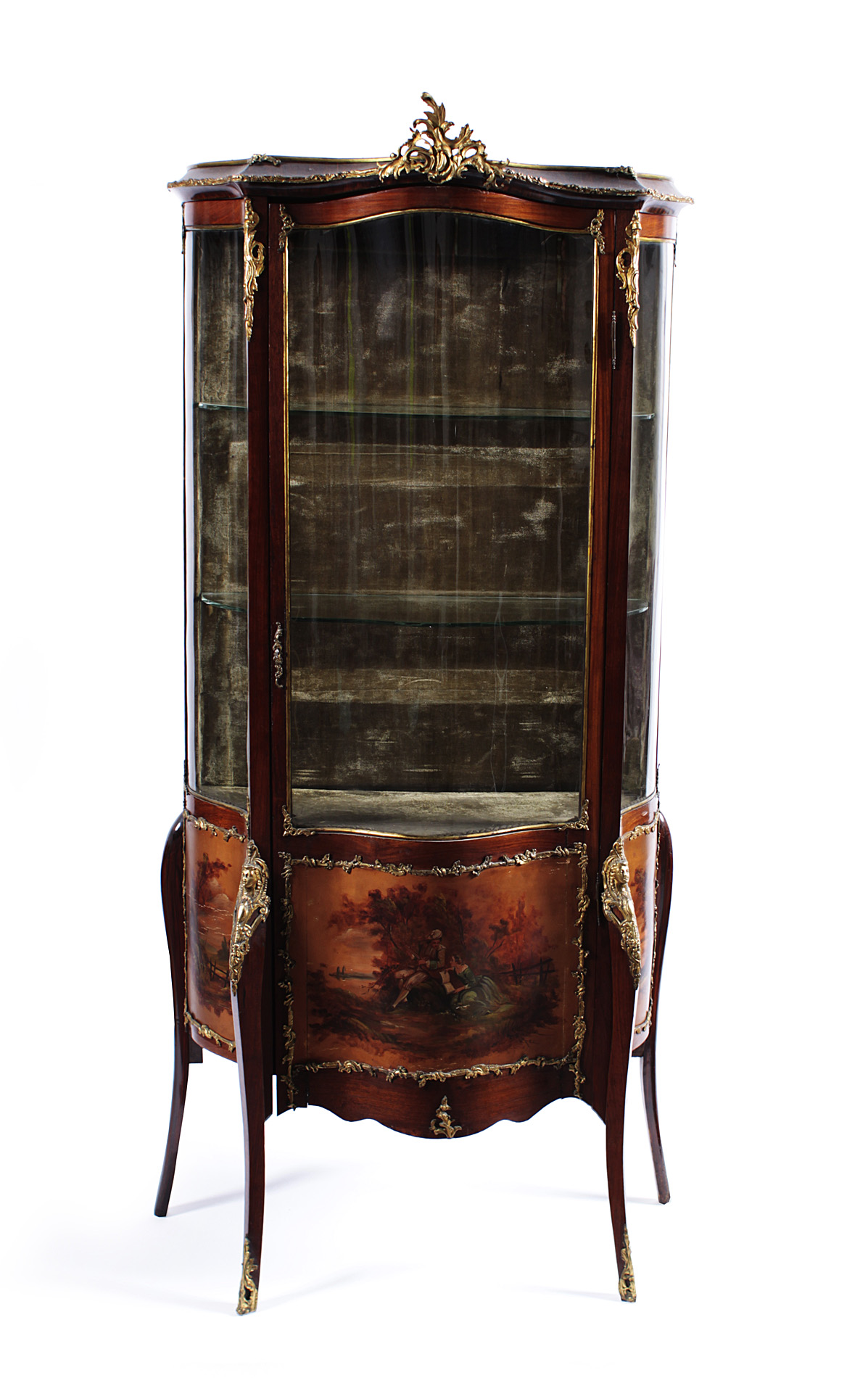 the moulded top above a serpentine glazed door over a painted figural scene raised on square cabriole legs