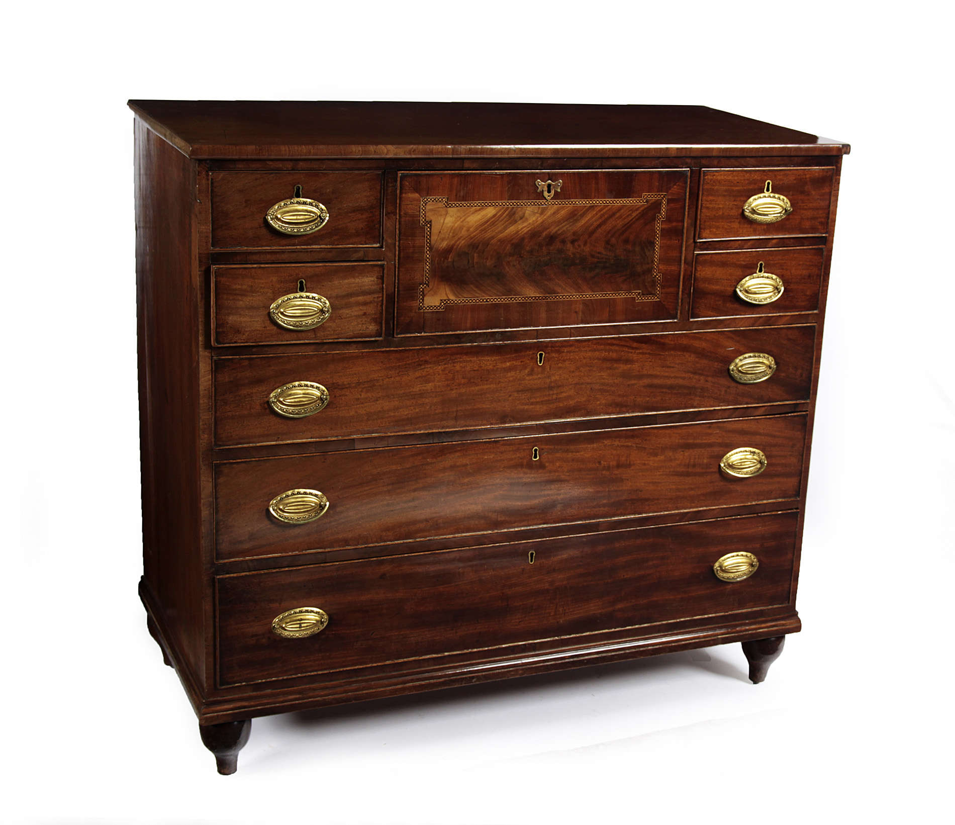 the moulded rectangular top over one deep hat drawer, flanked by four short drawers, over three graduated long drawers, raised on turned legs