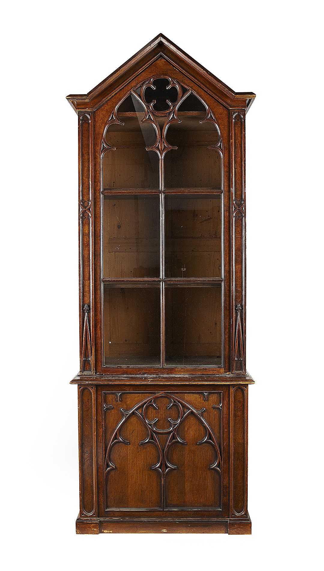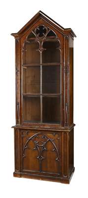 each with a moulded pediment over a glazed door with Gothic tracery panels, the lower part with a single cupboard door carved with a Gothic arch, on a plinth base (3)