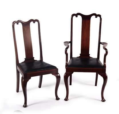 the shaped top rail over a vertical splat, drop in pad seat, raised on cabriole legs, including two open arm chairs