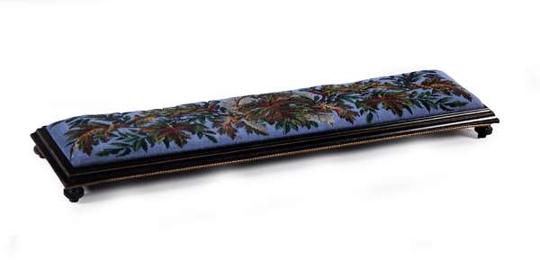 the foliate beadwork cushioned top over an ebonised and brass mounted base, raised on turned feet