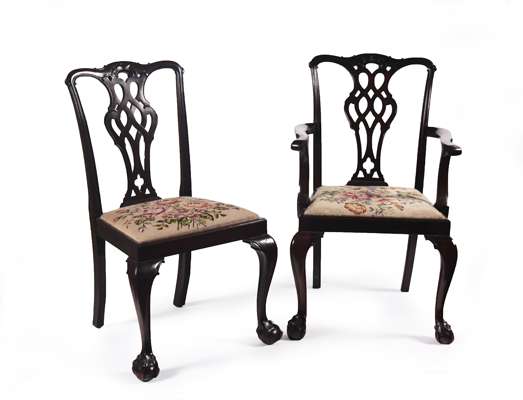 the moulded top rail over a pierced vertical splat, drop in pad seat, raised on cabriole legs with ball and claw feet