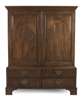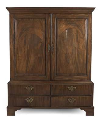 the moulded cornice over a pair of panel cupboard doors opening to sliding tray shelves, the lower part with two short over two further short drawers, on bracket feet