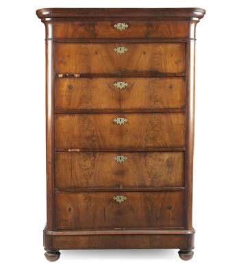 the moulded cornice over a single frieze drawer over five drawers, on turned bun feet