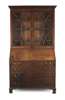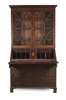 the plain cornice above a dentil tooth frieze and astragal glazed doors over fall flap bureau with four graduated long drawers, bracket feet