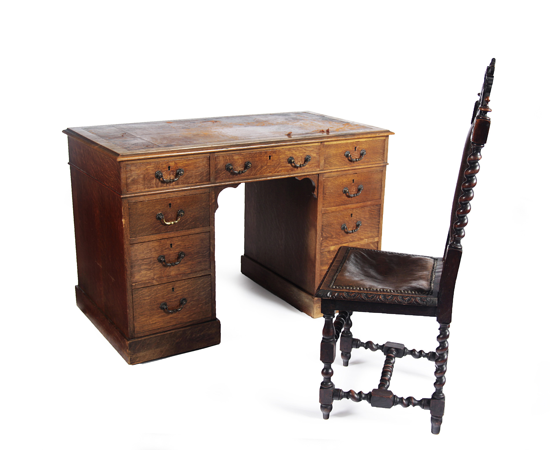 the moulded rectangular top with inset skiver above three frieze drawers, over six pedestal drawers, raised on plinth bases; 122cm wide, 80cm high, 66cm deep also a Victorian Carolean style side chair, the cushioned splat flanked by spiral turned supports, over a cushioned seat, raised on spiral turned legs and stretchers;47cm wide, 116cm high, 42cm deep