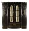 the centre section with a pair of bow front glazed doors opening to a void interior, over a single deep drawer, flanked by bowed panel doors carved with medieval figures and motifs, opening to a void interior, raised on a plinth base