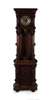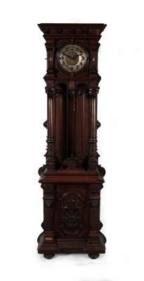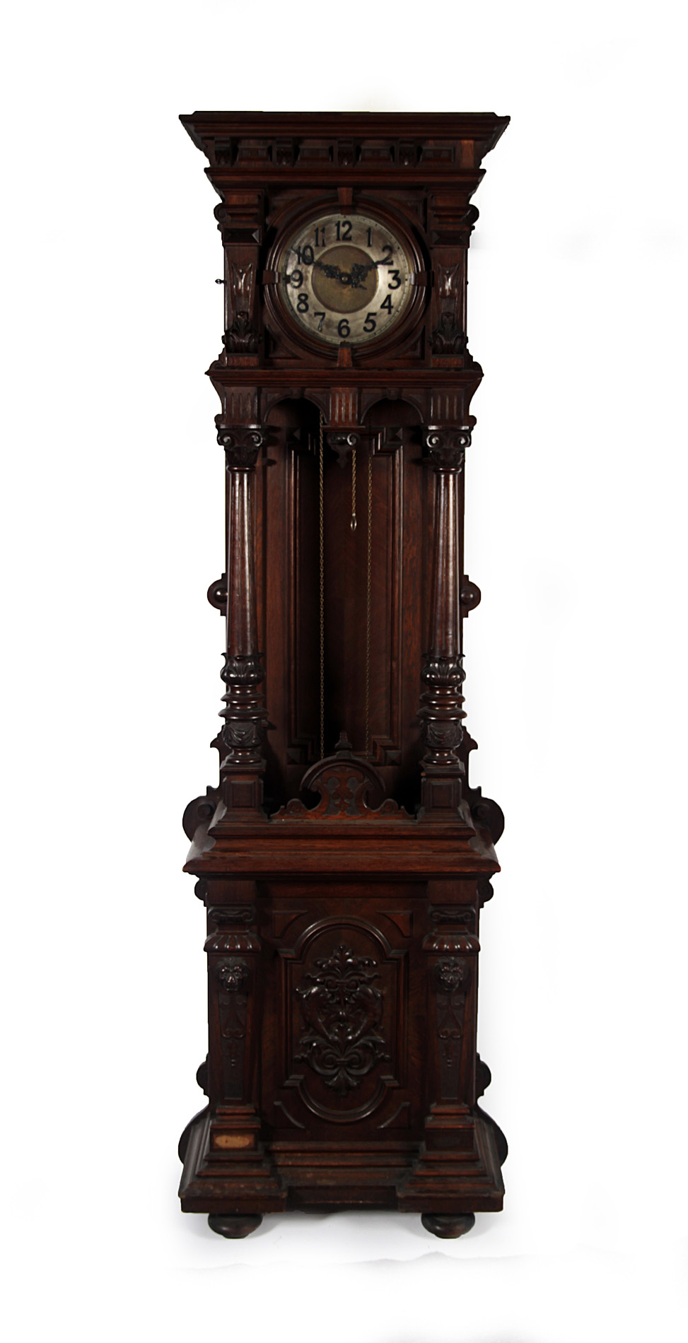 the gilt and silvered face within a carved and moulded case, flanked by acanthus carved and fluted columns, over a carved base raised on bun feet