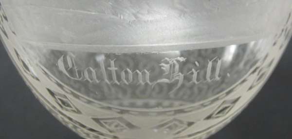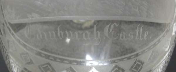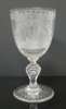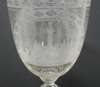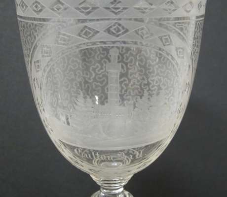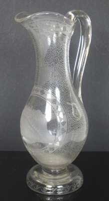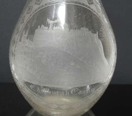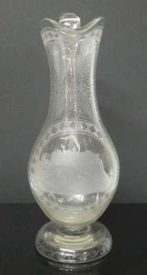 each with decorative borders and wave style decoration: the ewer of globular body with tapering neck and a central etched scene of Edinburgh Castle, 32.5cm high; and the goblet with a bell shaped bowl, cut baluster stem and circular foot, with an etched scene of Calton Hill, 18cm high (2)